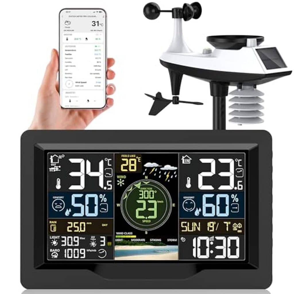 【Station Meteo 14-en-1 WIFI : Capteurs Haute Précision Pour une Analyse Complete】Cette station meteo interieur exterieur sans fil dispose d'un grand écran HD de 20,5 cm offrant une lisibilité optimale. Elle intègre toutes les fonctions essentielles : mesures précises de la température, humidité, vitesse/direction du vent, précipitations, indice UV, intensité lumineuse et pression. Fournit également des prévisions fiables, phases de la lune et données environnementales. L'étalonnage manuel garantit une exactitude durable. Idéale pour amateurs de météo, jardiniers et agriculteurs 【Donnees Synchronisees en Temps Réel avec les Services Meteo】Cette station meteo connectée intègre le Wi-Fi pour synchroniser automatiquement vos données avec Weather Underground et Weather Cloud. Accédez en temps réel aux informations locales et à l’historique météo depuis n’importe quel appareil (smartphone, tablette, ordinateur). Une solution parfaite pour ceux qui nécessitent une analyse climatique précise et un suivi personnalisé 【Portée Sans Fil de 100M et Installation Simplifiée】Le capteur extérieur étanche offre une connexion sans fil stable jusqu’à 100M. Le signal traverse efficacement les obstacles (arbres, murs) pour une transmission fiable. Grâce à son guide d’installation clair et ses accessoires bien conçus, la mise en place est rapide et facile. Installez le capteur au jardin, sur le balcon ou le toit 【Écran Large 20,5CM et Système D’alertes Personnalisables】L’écran LCD de grande taille et à luminosité ajustable reste parfaitement lisible quelle que soit la lumière. Les informations sont organisées en zones distinctes pour une consultation intuitive. Définissez des seuils personnalisés pour déclencher des alertes immédiates sur le vent, la température, l’humidité, la pression, les UV ou les précipitations. Son design épuré s’intègre discrètement dans votre salon, bureau ou espace de vie 【Capteur Suisse de Température/Humidité, Précision Extrême】Équipée d’un capteur suisse remplaçable, cette station météo mesure la température extérieure de -40°C à 60°C (±0,3°C) et l’humidité de 1% à 99% (±0,3%). Elle calcule et affiche le refroidissement éolien et le point de rosée pour vous aider à planifier en toute sérénité les activités extérieures